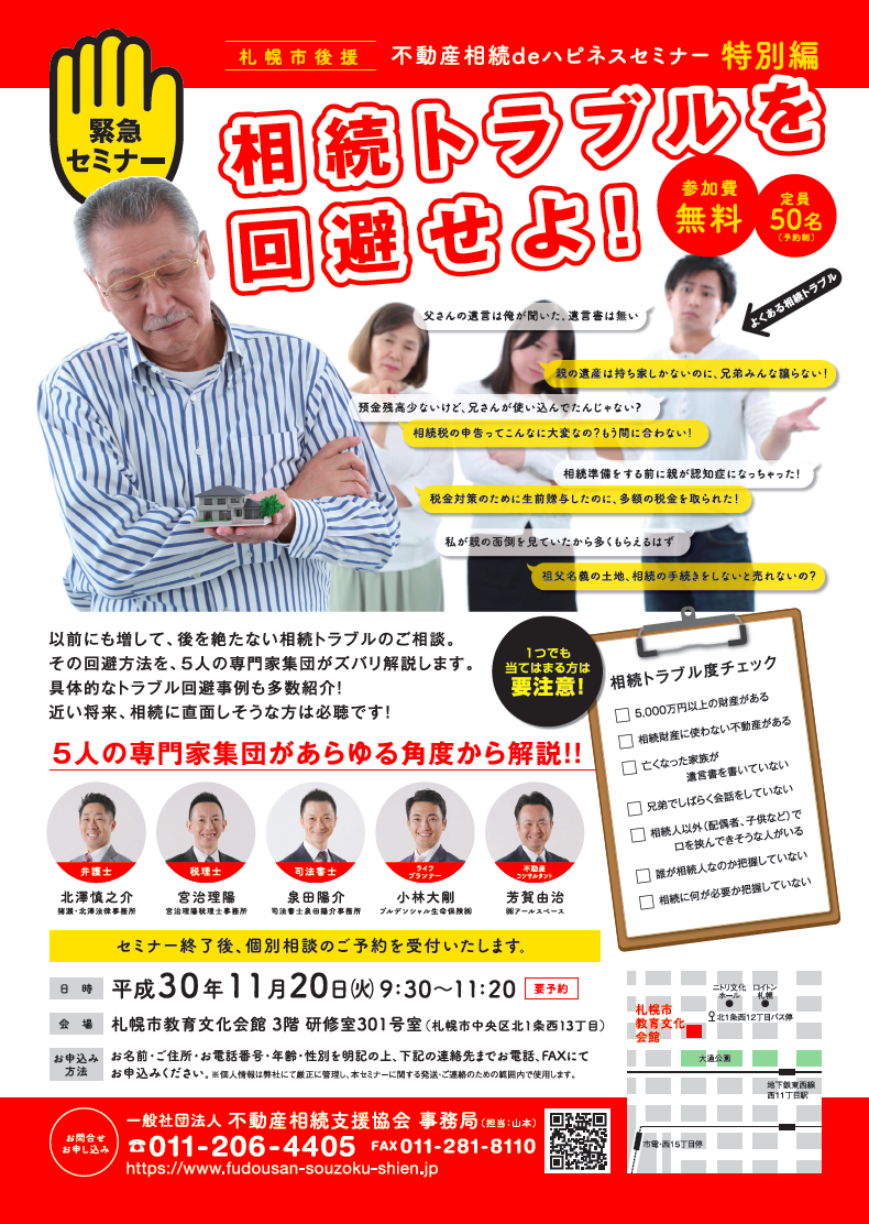 札幌市教育文化会館で毎月開催し、ご好評をいただいている 「不動産相続deハピネスセミナー」。 通常は、5人の専門家が交代で登壇し、皆さんに不動産相続の知識について講義形式でお伝えしていますが、今回は少し趣向を変え、専門家 … 続きを読む 「不動産相続deハピネスセミナー特別版」を開催いたします